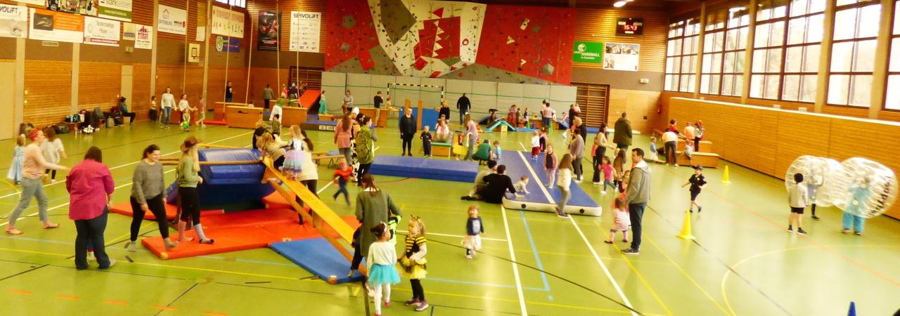 Von 16.30 bis 17.30 Uhr waren über 70 Turnmäuse, Turnlöwen und Elefanten in der Sporthalle unterwegs. Nach einem gemeinsamen Lied freuten sich alle über die große Gerätelandschaft in der Halle. Mit Begeisterung wurde ein Parcours gemeistert, geklettert, gerutscht und natürlich ausgiebig gehüpft. Die große Hüpfburg war dicht umlagert.